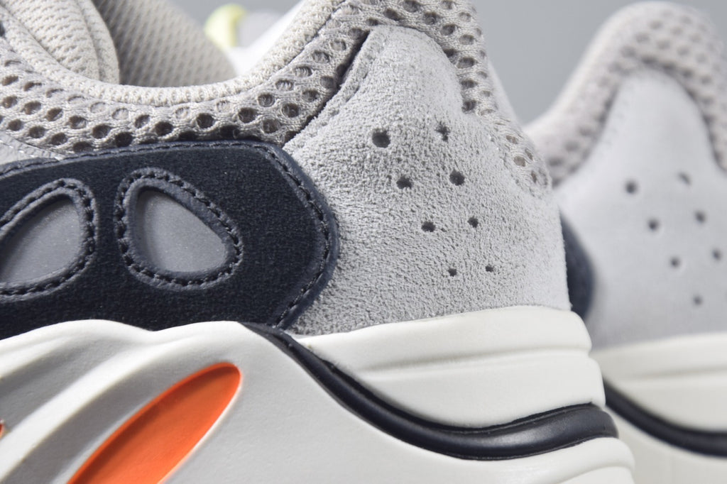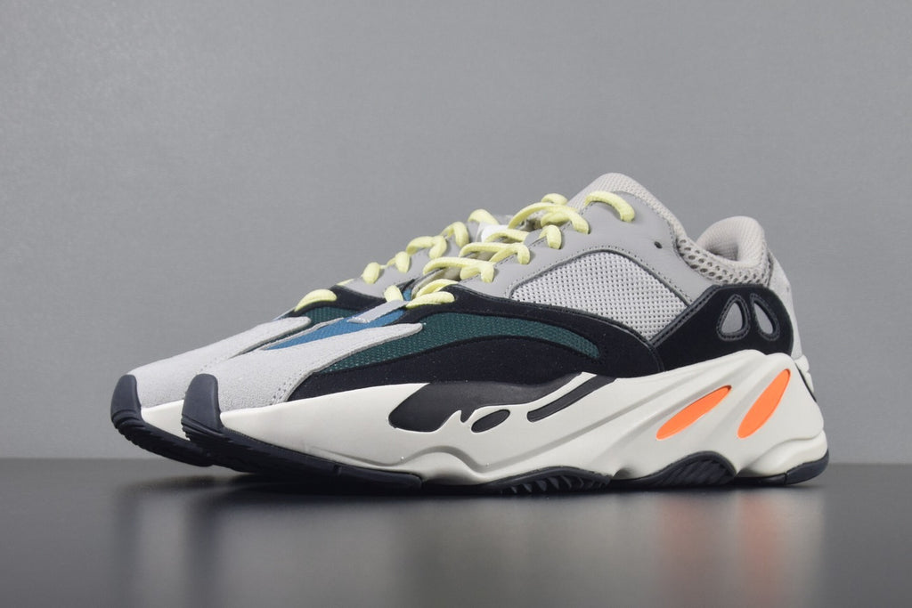 The sneaker’s retro-inspired lines worked in tandem with a chunky silhouette reminiscent of an earlier era. A mesh base is finished in grey on the quarter panels and bright blue and teal on the forefoot. The shoe features an upper with grey and black suede overlays, premium leather with blue mesh underlays, neon green laces, and its signature chunky midsole with encapsulated Boost technology.