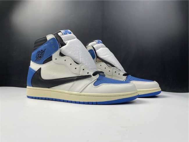 Dressed in a Sail, Black, Military Blue, and Shy Pink color scheme. This Air Jordan 1 features a White leather upper with a Blue toe box, ankle flaps, heels, and rubber outsole while having Travis’ signature flipped Black Swooshes on the sides. “Cactus Jack” branding on the tongue and a stitched up smiley face on the left heel, while Hiroshi Fujiwara’s double lightning bolt motif can be seen on the right completes the design.