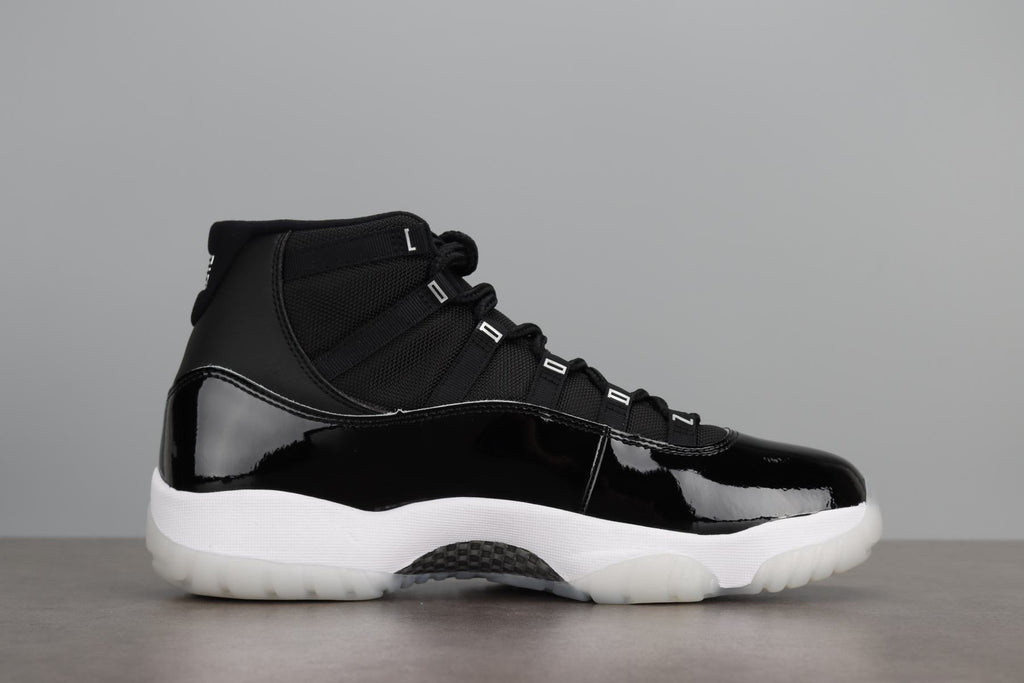 Dressed in a Black, Clear, White, and Metallic Silver color scheme. This year’s Air Jordan 11 features a Black mesh base with leather in the rear along with matching patent leather. Other details includes a metal Jumpman logo and #23 embroidery at the heel with Silver “JORDAN” branding across the eyelets similar to the “Gold Eyelet” DMP Air Jordan 11s. A White midsole atop a clear translucent outsole with “25” on the insoles completes the design.