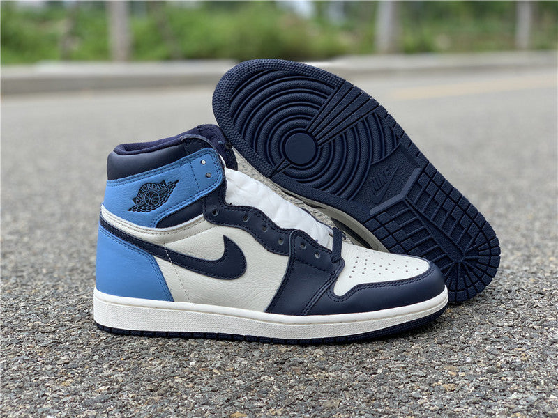 Dressed in a Sail, Obsidian, and University Blue color scheme. This Air Jordan 1 has a lot of similarities to the “UNC Patent” pair that dropped back in February. Instead of having a patent leather build, this release comes in full leather. It features Sail leather on the upper with Obsidian and University Blue overlays.
