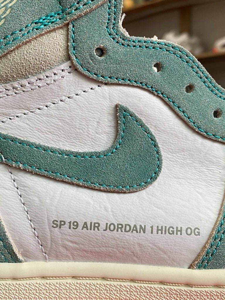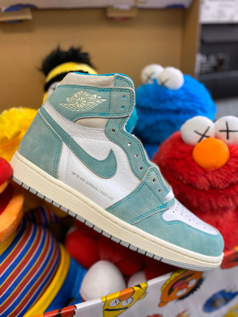 This Air Jordan 1 comes dressed in a Turbo Green, White, Light Smoke Grey and Sail color combination. Featuring a vintage – worn look to them, on the lateral panels it reads ‘SP 19 Air Jordan 1 High OG. Turbo Green lands on the overlays while White is applied to the sides and toe. Following we have Yellow for the Nike Air branding on the tongue, Sail midsole and a Grey outsole completes the look.