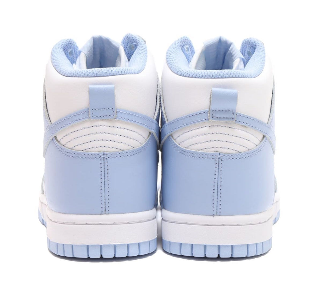 Dressed in a White and Aluminum color scheme. This NIKE DUNK HIGH features a White leather base, nylon tongues, and midsole paired with Aluminum Blue – not University Blue – leather and Swoosh overlays. The same light hue continues on the laces, liner, tongue labels, insole, and rubber outsole completes the design.