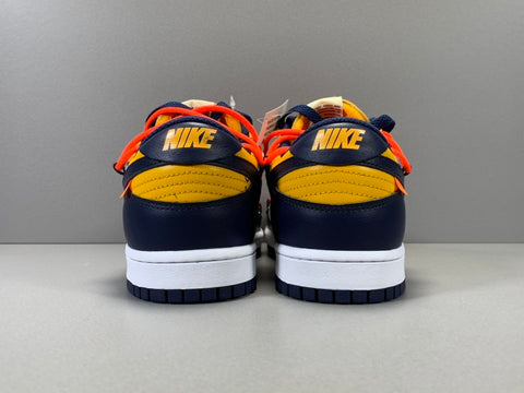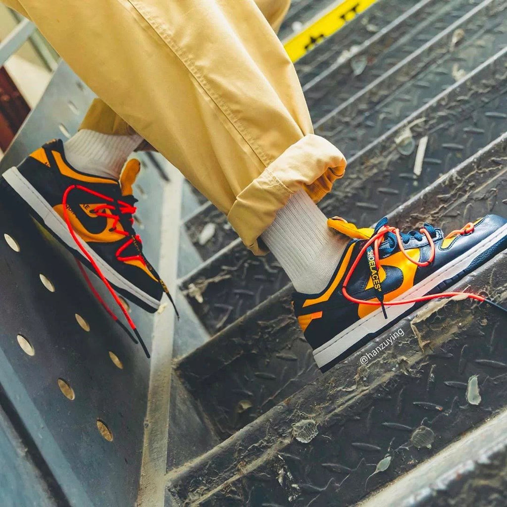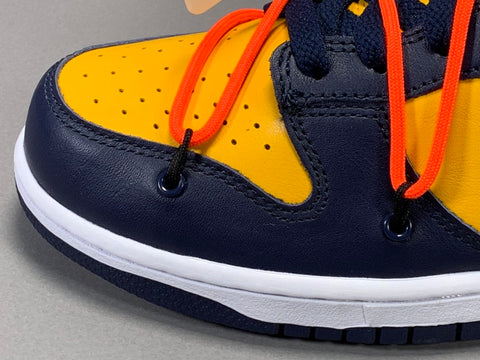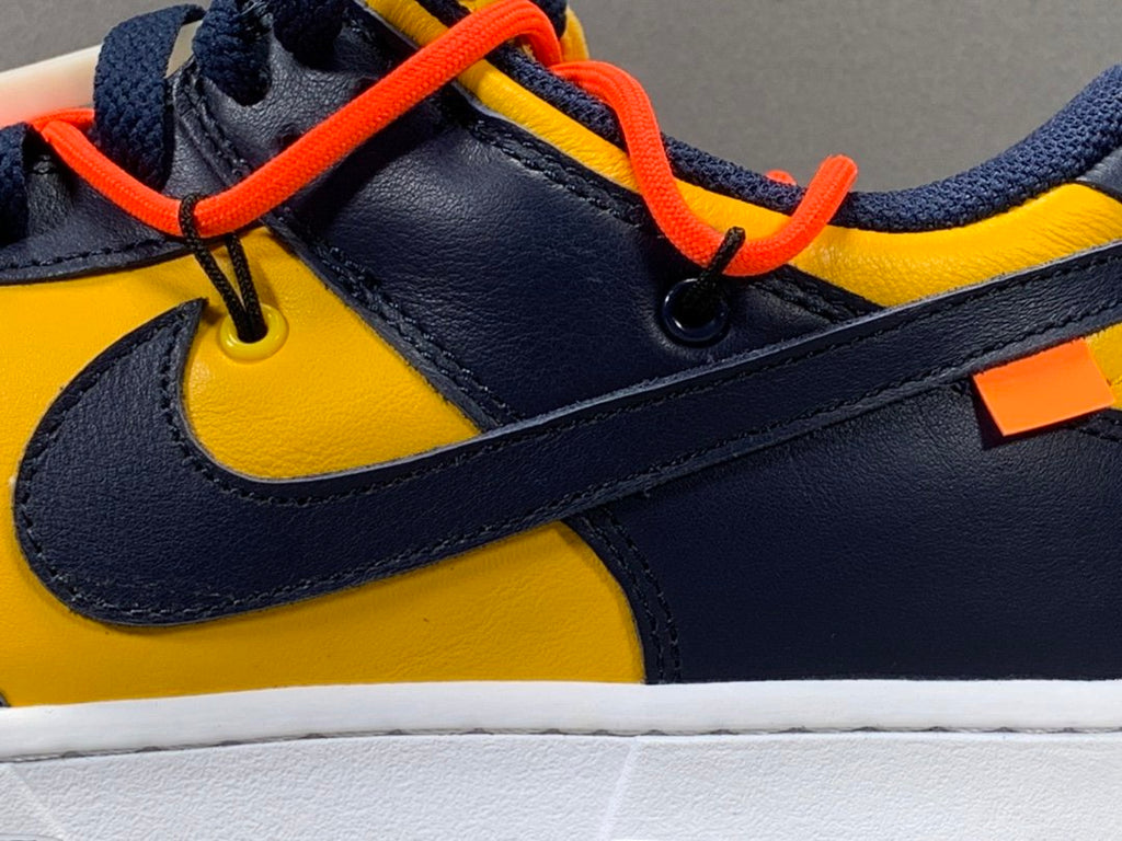Virgil Abloh pays homage to Nike Basketball silhouettes from the 1980's skate culture with the Nike Dunk Low Off-White Michigan, now available on Kickscrew. When Nike launched the Dunk as the cornerstone of the program of their Nike College Color in 1985, seven different colleges were depicted in the first colorways that were offered, with Michigan being one of the first.